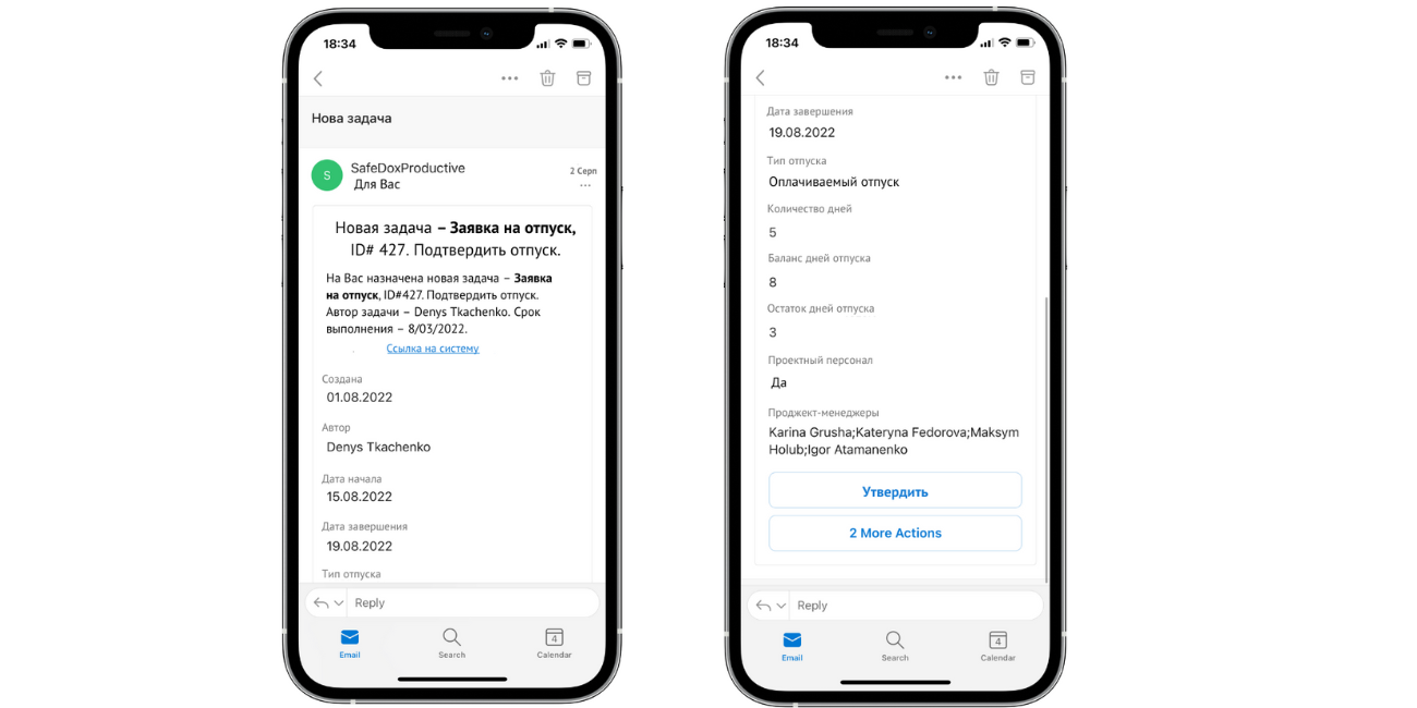 Мы не хотим, чтобы SafeDox стал очередным всегда открытым окном у вас на столе. И не хотим, чтобы необходимость переходить в его интерфейс помешала вам принимать решение «прямо сейчас». Поэтому мы доставляем задачи в те приложения, которые у вас и так уже открыты. Например, Microsoft Outlook.