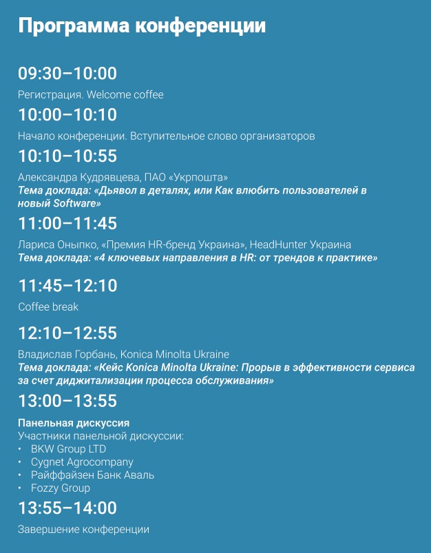 Основные темы, которые будут обсуждаться на конференции: что такое трансформация, ее составляющие, как начать трансформировать свой бизнес и вовлечь в процесс сотрудников.
