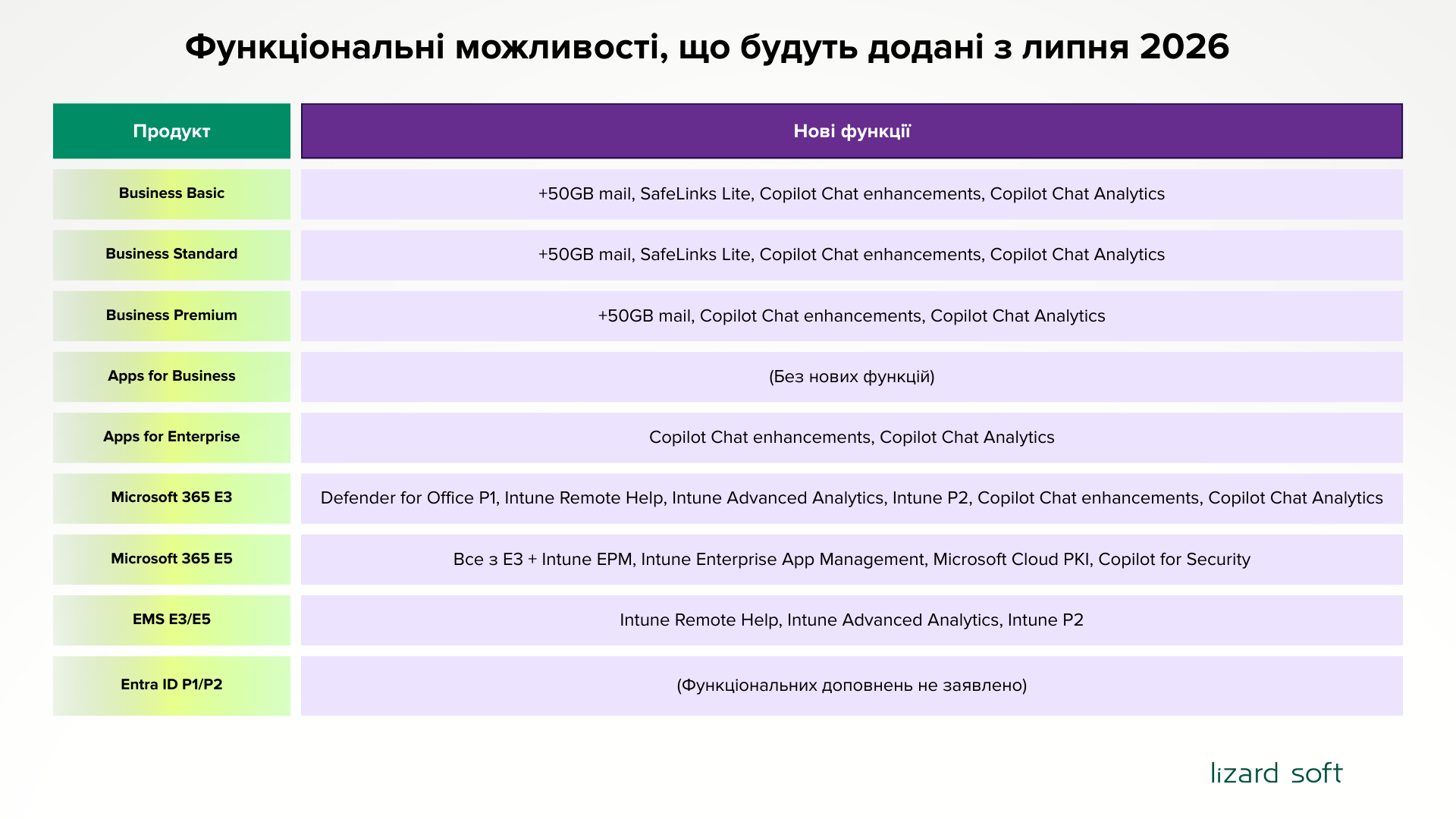 Microsoft пояснює, що корекція цін відображає інвестиції в безпеку, AI-функціонал та хмарну інфраструктуру. Також з липня 2026 року до ліцензій буде додано низку нових функціональних можливостей: